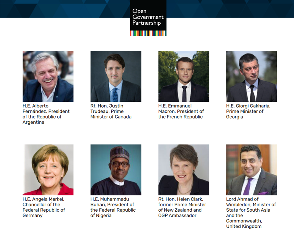 შეხვედრის მონაწილეებს მიმართეს OGP-ის მმართველი კომიტეტის წევრებმა, მათ შორის, გერმანიის ფედერაციული რესპუბლიკის კანცლერმა ანგელა მერკელმა, საფრანგეთის პრეზიდენტმა ემანუელ მაკრონმა და კანადის პრემიერ-მინისტრმა ჯასტინ ტრუდომ.